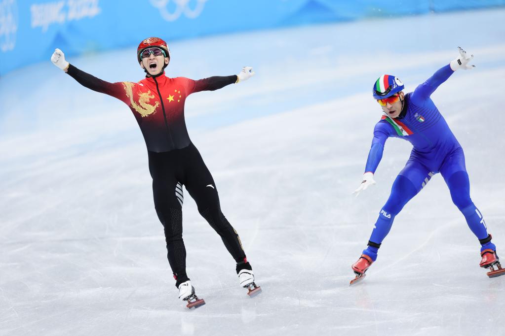 Ren Ziwei of China celebrates after winning the gold medal of the men's short track speed skating 1,000m final at the Beijing 2022 Olympic Winter Games in Beijing, capital of China, Feb. 7, 2022. (Xinhua/Lan Hongguang)