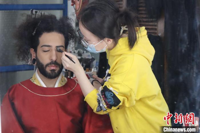 A dresser puts make-up on Rian, a young Brazilian. (Photo/Li Yifan)