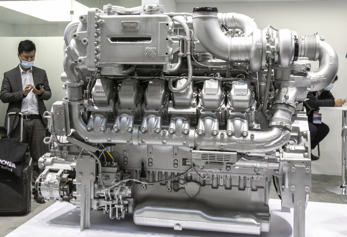 A visitor checks out a Rolls-Royce engine during a heavy equipment exhibition in Shanghai in November, 2021. [Photo/CHINA DAILY]