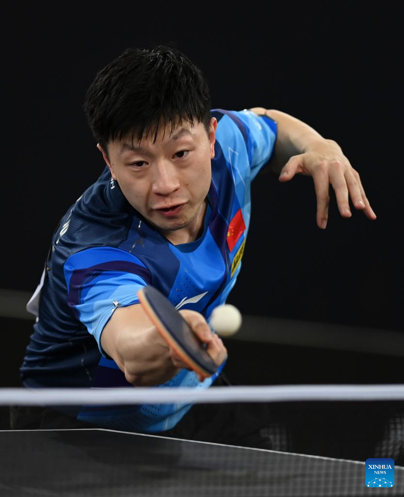 Ma Long of China hits a return during the men's singles round of 32 match against Yoshimura Maharu of Japan at World Table Tennis Championships (WTTC) Asian Continental Stage in Doha, Qatar, Jan. 10, 2023. (Photo by Nikku/Xinhua)