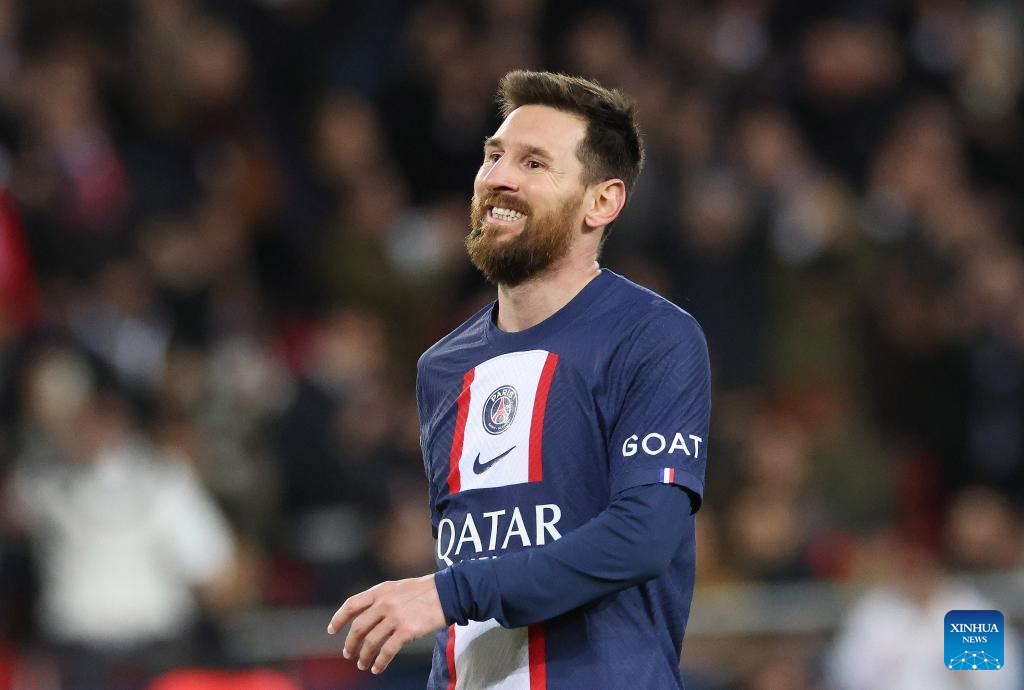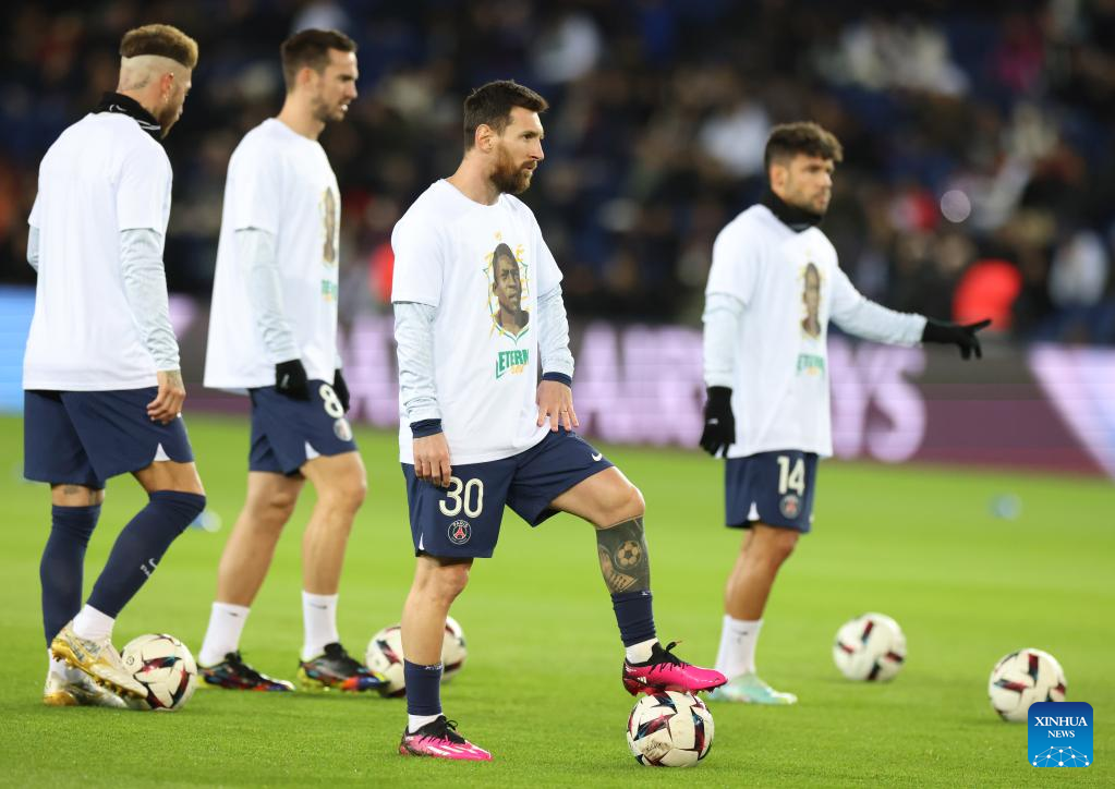 Paris Saint-Germain's Lionel Messi warms up before the French League 1 football match between Paris Saint-Germain FC and Angers at the Parc des Princes stadium in Paris, Jan. 11, 2023. (Xinhua/Gao Jing)