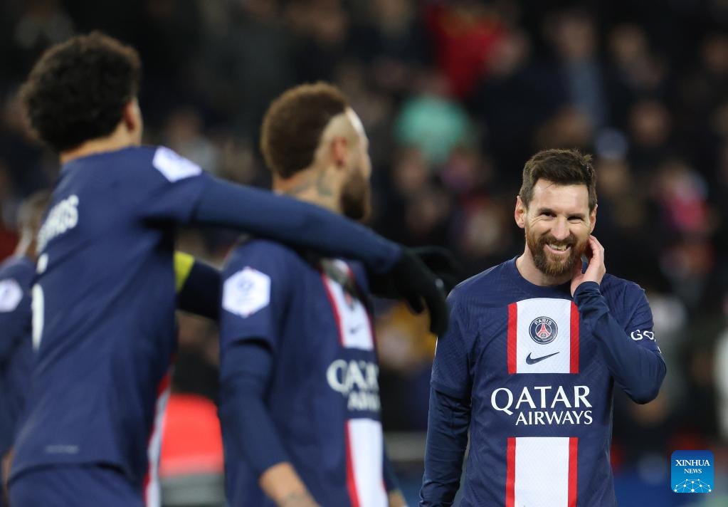 Paris Saint-Germain's Lionel Messi (L) dribbles during the French League 1 football match between Paris Saint-Germain FC and Angers at the Parc des Princes stadium in Paris, Jan. 11, 2023. (Xinhua/Gao Jing)