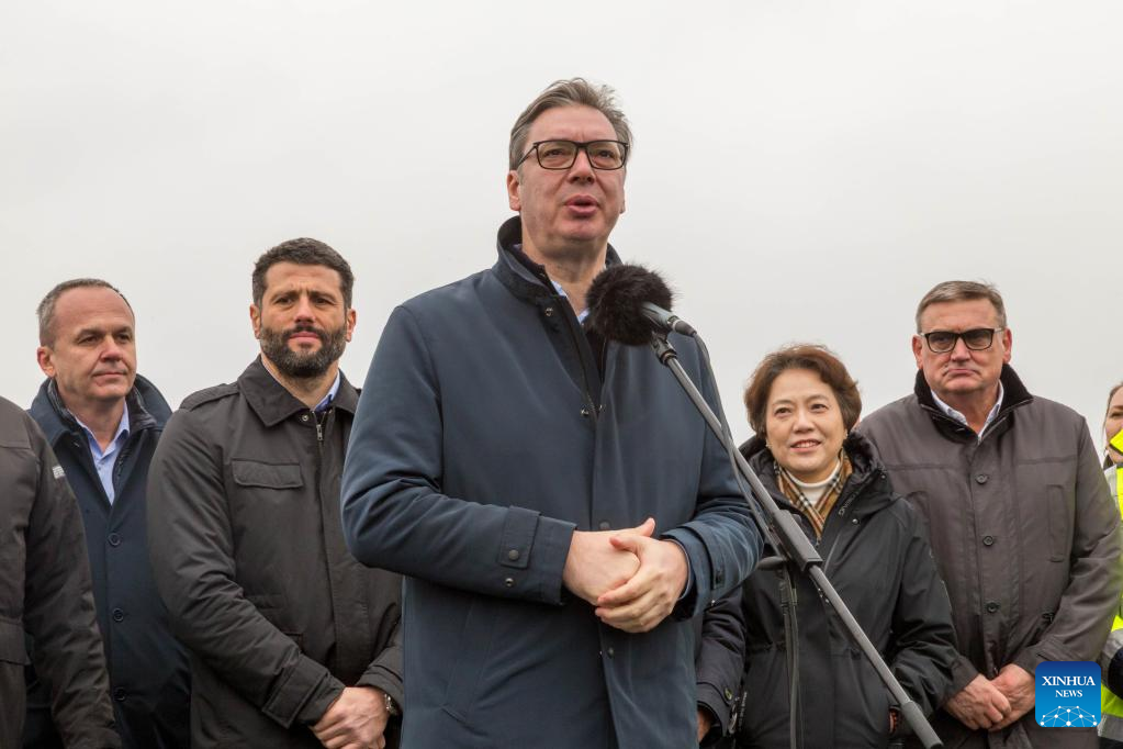 Serbian President Aleksandar Vucic (Front) speaks during his visit to the construction site of a key 7.9-kilometer section of the Chinese-built Belgrade bypass near Surcin, southwest of Belgrade, Serbia, on Jan. 11, 2023. The key 7.9-kilometer section of the Chinese-built Belgrade bypass is almost finished with excellent quality, Serbia's President Aleksandar Vucic said after visiting the construction site at an interchange near Surcin on Wednesday. (Xinhua/Shi Zhongyu)