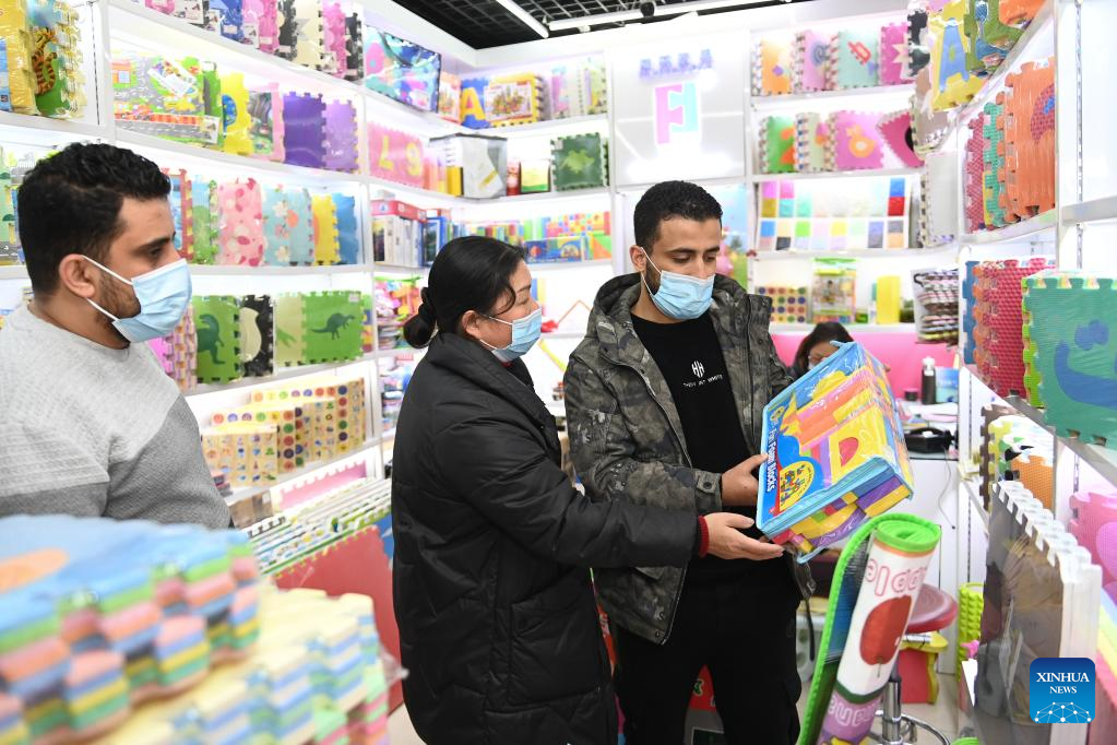 A foreign merchant (R) buys toys at the Yiwu International Trade Market in Yiwu, east China's Zhejiang Province, Jan. 11, 2023. According to data from the local exit-entry administration, there have been over 10,000 resident foreign merchants in Yiwu up to now. (Xinhua/Huang Zongzhi)