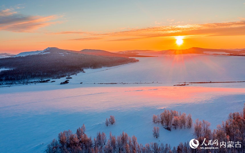 Under the sunset glow, the snow-covered land looks like a majestic Chinese freehand landscape painting in Greater Hinggan Mountains in north China’s Inner Mongolia Autonomous Region. (People's Daily Online/Li Ming)