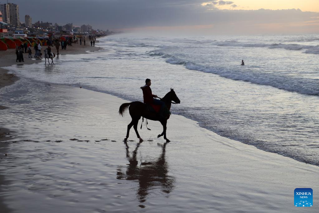 A man rides a horse on a beach of the Mediterranean Sea at sunset in Gaza City, on Jan. 13, 2023. (Photo by Rizek Abdeljawad/Xinhua)