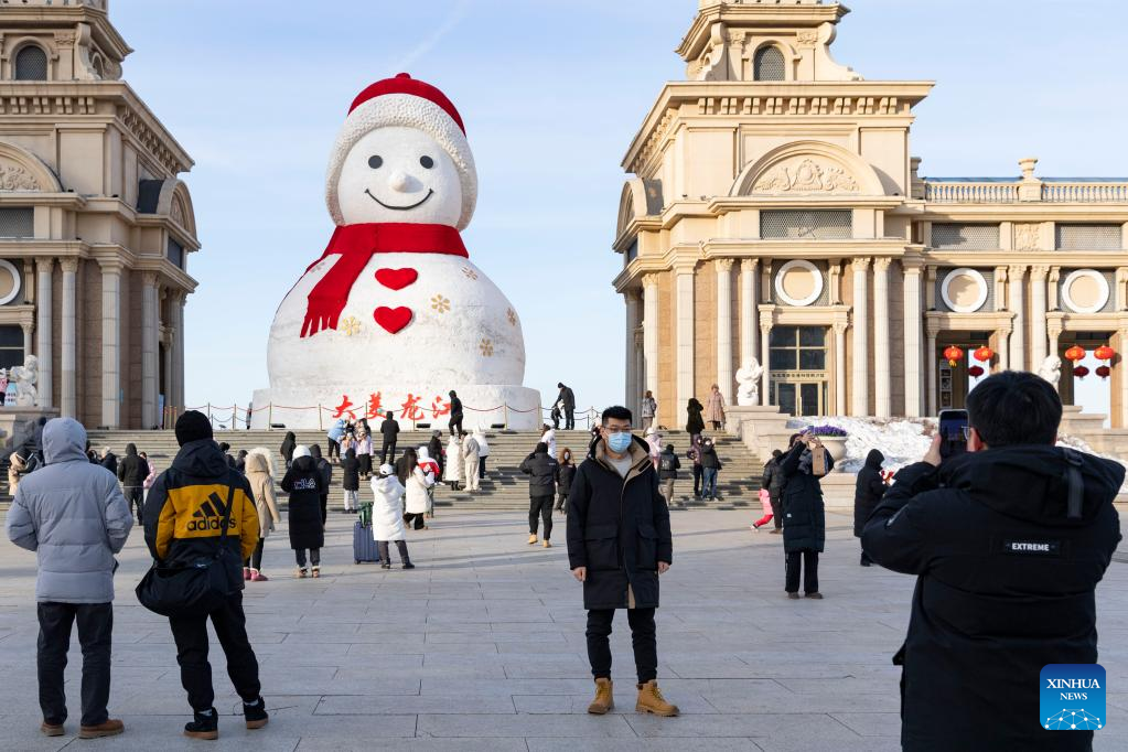 People pose for photos with a giant snowman in Harbin, northeast China's Heilongjiang Province, Jan. 14, 2023. Harbin is famous for its rich ice and snow resources. This winter, the city opened three ice and snow-themed parks, launched 12 ice and snow experience products and 10 such tourism routes, and created more than 100 related activities to promote the development of winter tourism, culture, fashion and sports. (Xinhua/Xie Jianfei)