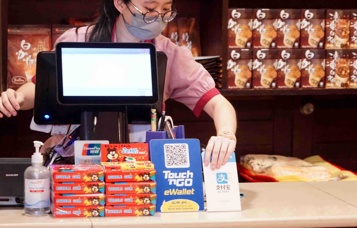 A cashier at a souvenir shop in Malacca, Malaysia, puts up an Alipay sign on Jan 4 to cater to Chinese tourists. CHEN YUE/CHINA NEWS SERVICE