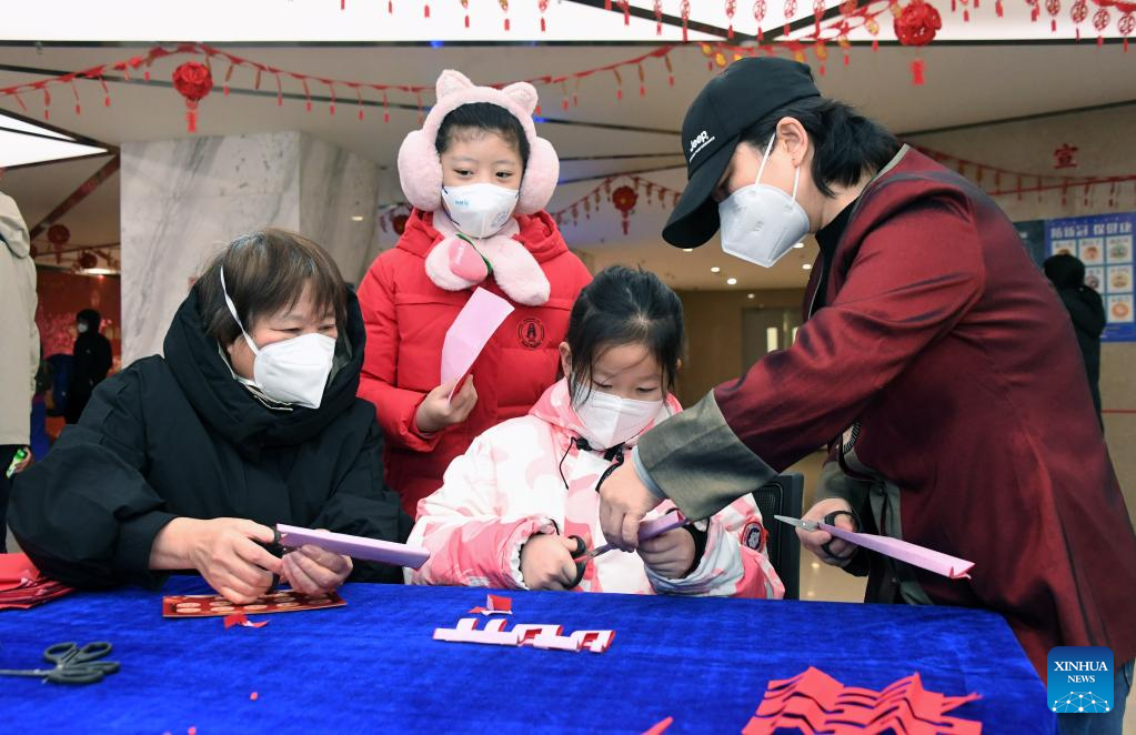 People experience traditional Chinese art of paper cutting inside the north division of Haidian culture center in Haidian District of Beijing, capital of China, Jan. 14, 2023. The Spring Festival culture season kicked off at the north division of Haidian culture center on Saturday, fulfilling the cultural needs of residents with various activities during the Spring Festival. (Xinhua/Ren Chao)