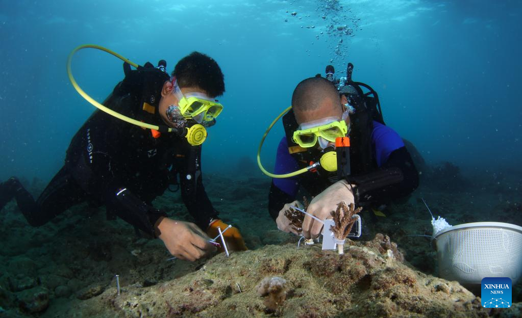 Divers transplant corals underwater in Yalong Bay, Sanya, south China's Hainan Province, Nov. 17, 2022. A coral reef ecosystem restoration project has been completed in waters of the Yalong Bay in Sanya. The work is done by means of placing artificial reefs and transplanting coral seedlings. Over 80 percent of the coral seedlings are expected to live for at least six months, while over 70 percent will survive for at least one year. (Xinhua/Yang Guanyu)