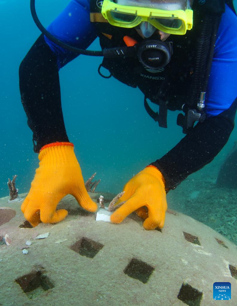 A diver transplants corals onto an artifical reef in Yalong Bay, Sanya, south China's Hainan Province, Nov. 16, 2022. A coral reef ecosystem restoration project has been completed in waters of the Yalong Bay in Sanya. The work is done by means of placing artificial reefs and transplanting coral seedlings. Over 80 percent of the coral seedlings are expected to live for at least six months, while over 70 percent will survive for at least one year. (Xinhua/Yang Guanyu)