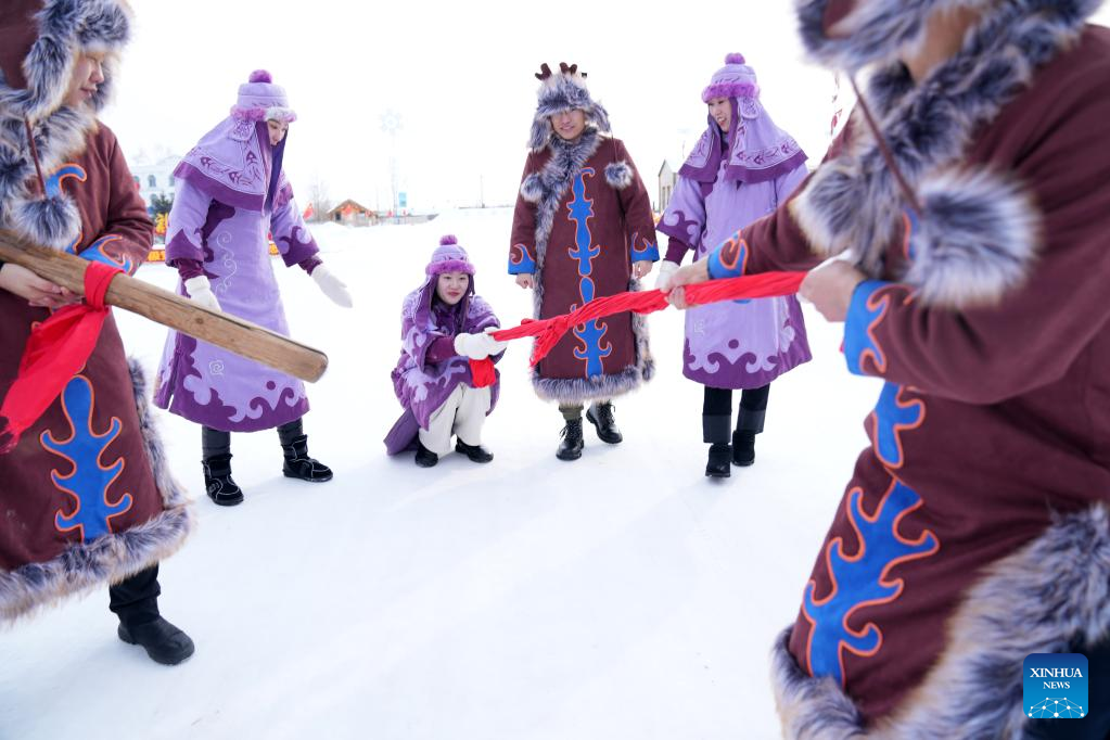 A group of Hezhe young people play on the snow in Hezhe ethnic village of Zhuaji in Wusu Town of Fuyuan City, northeast China's Heilongjiang Province, Jan. 11, 2023. (Xinhua/Wang Jianwei)