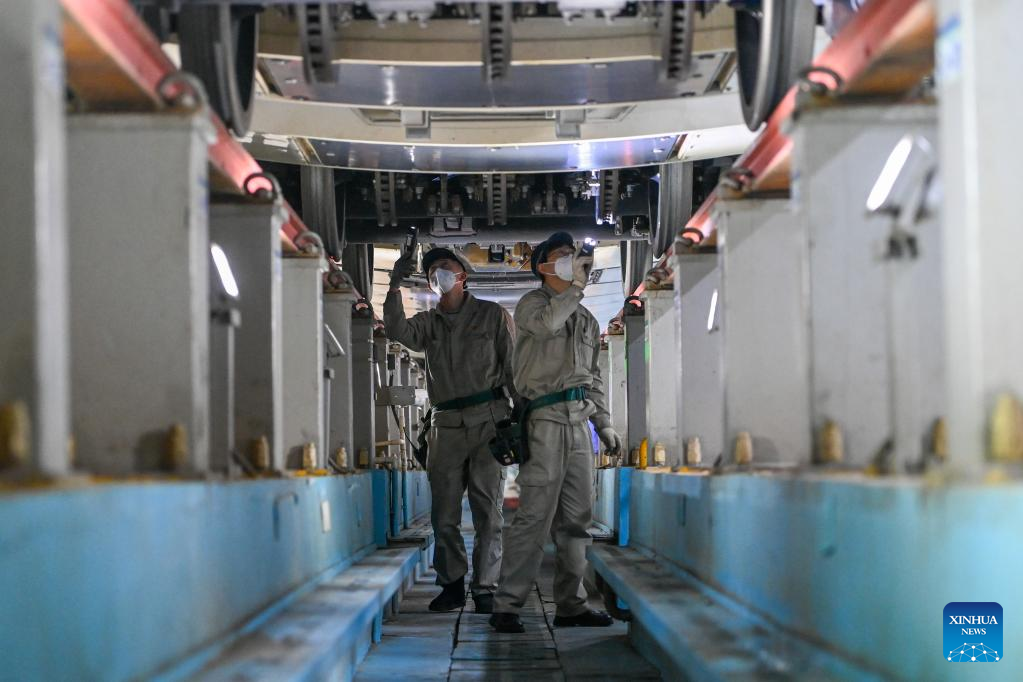Technicians inspect a bullet train at a maintenance center in Urumqi, northwest China's Xinjiang Uygur Autonomous Region, Jan. 14, 2023. Technicians at a high-speed train maintenance center in Urumqi have been busy carrying out maintenance work for trains during the Spring Festival travel rush. The Spring Festival travel rush, also known as "chunyun," began on Jan. 7 and will last until Feb. 15 this year, during which many Chinese people will travel to reunite with their families for the Chinese Lunar New Year, which falls on Jan. 22 this year. (Xinhua/Ding Lei)