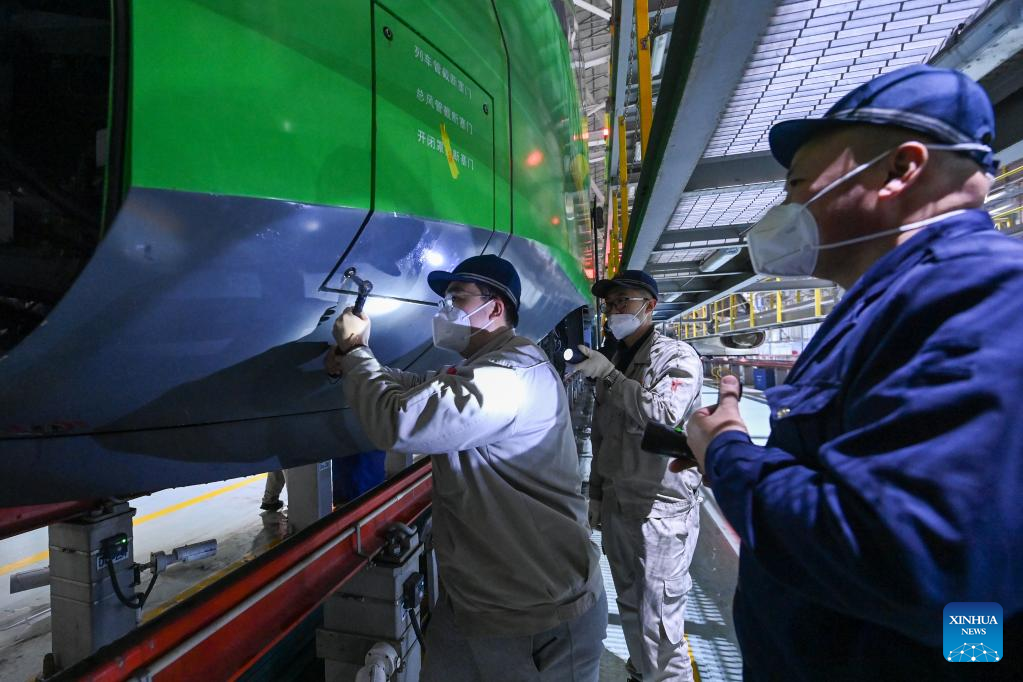 Technicians fasten the bolts of a bullet train at a maintenance center in Urumqi, northwest China's Xinjiang Uygur Autonomous Region, Jan. 14, 2023. Technicians at a high-speed train maintenance center in Urumqi have been busy carrying out maintenance work for trains during the Spring Festival travel rush. The Spring Festival travel rush, also known as "chunyun," began on Jan. 7 and will last until Feb. 15 this year, during which many Chinese people will travel to reunite with their families for the Chinese Lunar New Year, which falls on Jan. 22 this year. (Xinhua/Ding Lei)