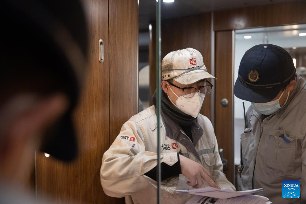 Staff members communicate in a carriage of the Fuxing Electric Multiple Unit (EMU) CR400BF-GZ in northeast China's Heilongjiang Province, Jan. 16, 2023. The most frost-resistant and most intelligent member of China's Fuxing bullet train family, the Fuxing EMU CR400BF-GZ, settled on Monday in northeast China's Heilongjiang Province. This is the region of the highest latitude and the lowest temperature that the EMU, with an operating speed of 350 km per hour, has ever reached by far. (Xinhua/Zhang Tao)