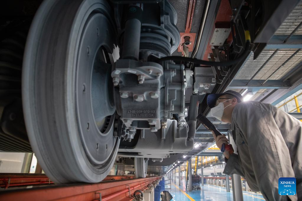 A staff member checks on the Fuxing Electric Multiple Unit (EMU) CR400BF-GZ at a maintenance station of China Railway Harbin Bureau Group Co., Ltd. in northeast China's Heilongjiang Province, Jan. 16, 2023. The most frost-resistant and most intelligent member of China's Fuxing bullet train family, the Fuxing EMU CR400BF-GZ, settled on Monday in northeast China's Heilongjiang Province. This is the region of the highest latitude and the lowest temperature that the EMU, with an operating speed of 350 km per hour, has ever reached by far. (Xinhua/Zhang Tao)