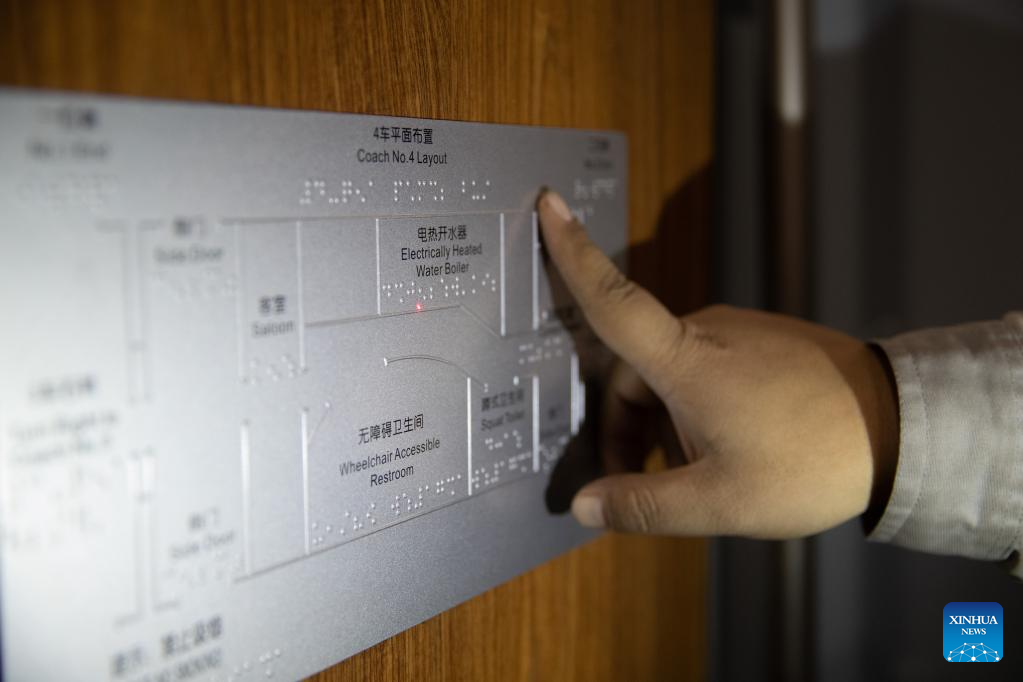 A staff member works in a specially-set barrier-free carriage of the Fuxing Electric Multiple Unit (EMU) CR400BF-GZ in northeast China's Heilongjiang Province, Jan. 16, 2023. The most frost-resistant and most intelligent member of China's Fuxing bullet train family, the Fuxing EMU CR400BF-GZ, settled on Monday in northeast China's Heilongjiang Province. This is the region of the highest latitude and the lowest temperature that the EMU, with an operating speed of 350 km per hour, has ever reached by far. (Xinhua/Zhang Tao)