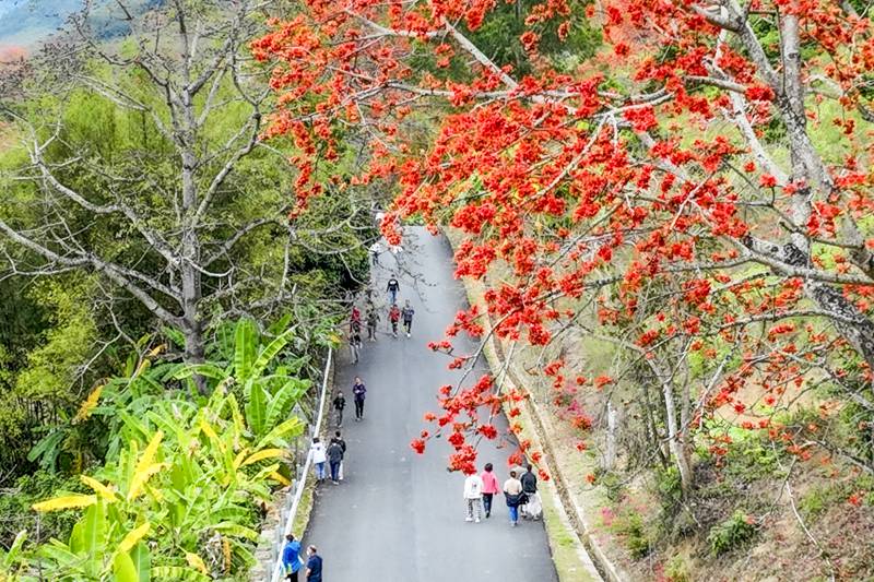 Tourists walk on a road lined with kapok trees in Changjiang Li autonomous county, south China's Hainan Province. (Photo courtesy of the publicity department of the CPC Changjiang County Committee)