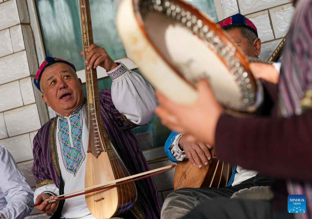 Sulayman Abdu rehearses with other folk artists at his residence in Muqam Village, Lukqun Town, Shanshan County, northwest China's Xinjiang Uygur Autonomous Region, Jan. 11, 2023. With all grape vines buried properly for their protection against cold in winter, people of Lukqun Town in Shanshan have concluded their farm work of the year and started to enjoy a leisure time. However, Sulayman Abdu, a resident of Muqam Village in Lukqun, still has his hands full with performance appointments from his neighbors. Sulayman Abdu, 61, has been studying and practicing Muqam since he was 16, and now has become an inheritor of this popular folk art. Muqam, a traditional art of the Uygur ethnic group in Xinjiang, combines songs, dances, folk and classical music. According to Sulayman Abdu, it has been an age-long custom for local people to watch Muqam performance on occasions of celebration and gathering. (Xinhua/Zhao Ge)
