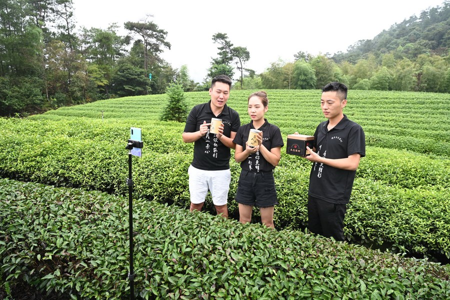 Livestreaming team members of Wuyishan Zhumeng Qianlan ecological tea cooperative promote tea products at a tea garden in Xingcun Township of Wuyishan, southeast China's Fujian Province, Aug. 17, 2021. (Xinhua/Lin Shanchuan)
