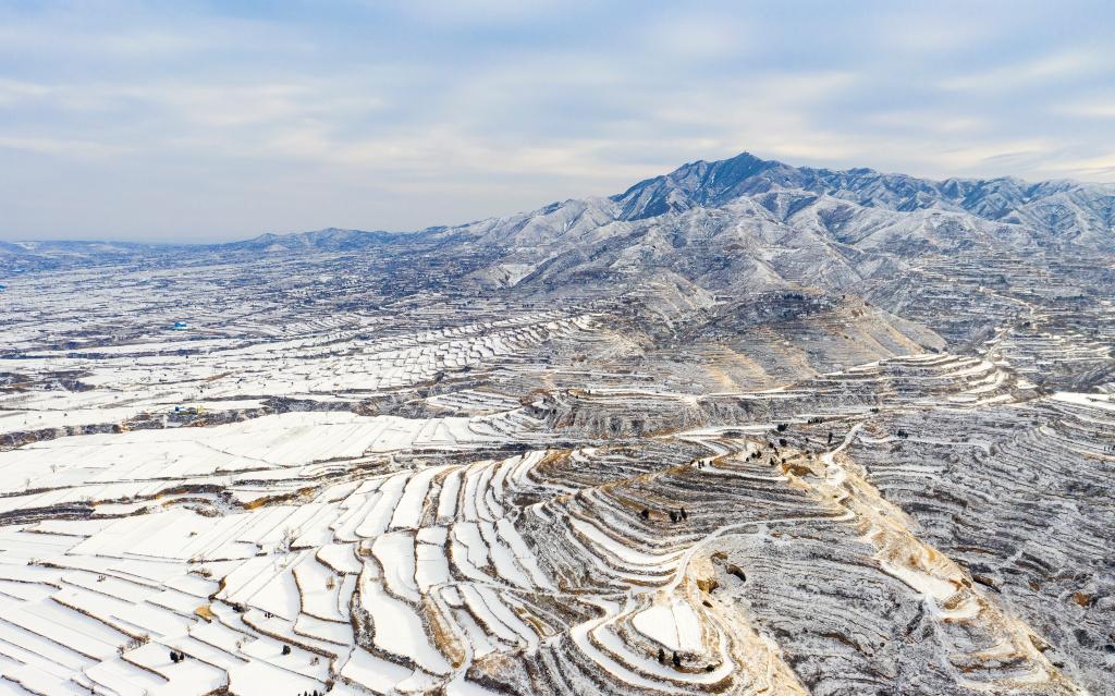 This aerial photo taken on Jan. 15, 2023 shows a view of snow-covered terraced fields in Xiangfen County of Linfen City, north China's Shanxi Province. (Photo by Li Xianjun/Xinhua)