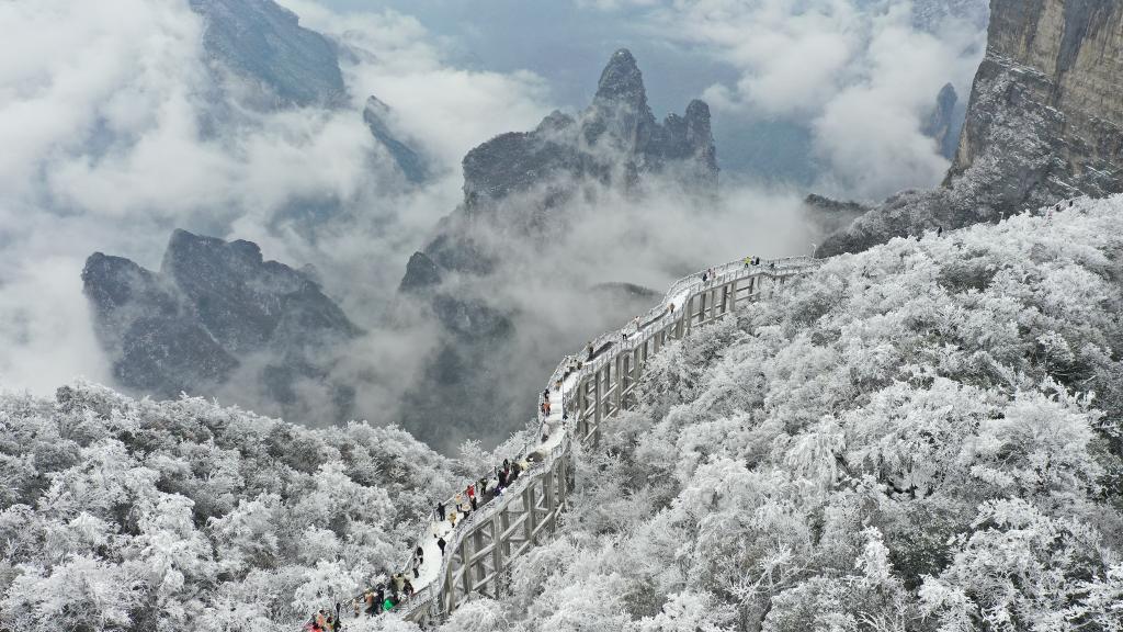 This aerial photo taken on Jan. 16, 2023 shows the snow scenery of Tianmenshan scenic area in Zhangjiajie, central China's Hunan Province. (Photo by Shao Ying/Xinhua)