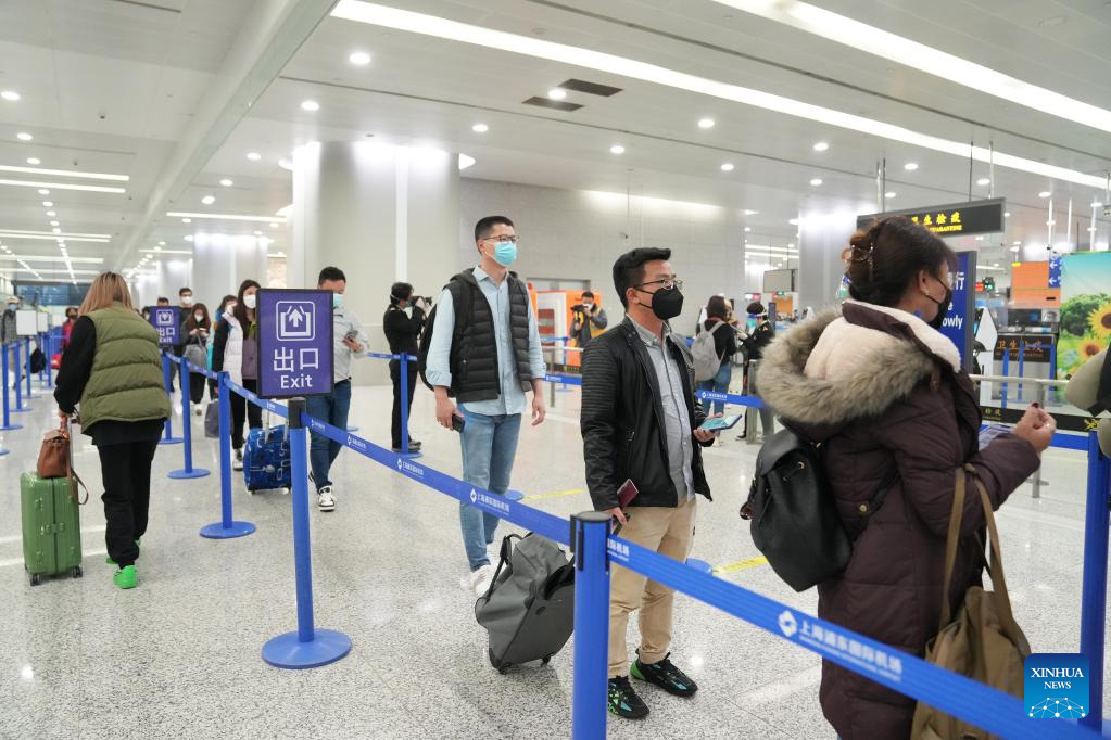 Passengers queue up to go through entry procedures at Shanghai Pudong International Airport in east China's Shanghai, Jan. 8, 2023. (Xinhua/Ding Ting)
