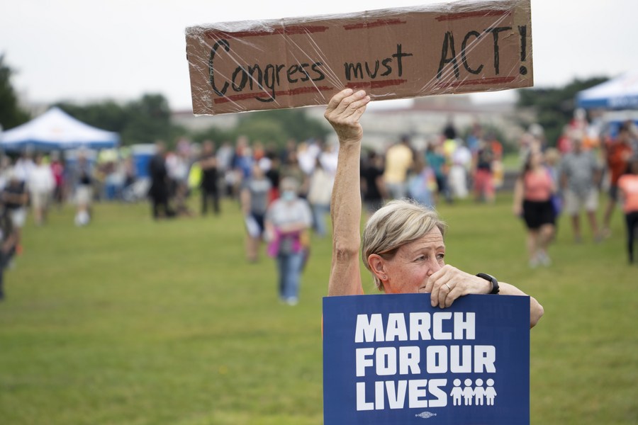People gather during a rally decrying rising gun violence while urging politicians to take action in Washington, D.C., the United States, June 11, 2022. (Photo by Xiao Xiao/Xinhua)