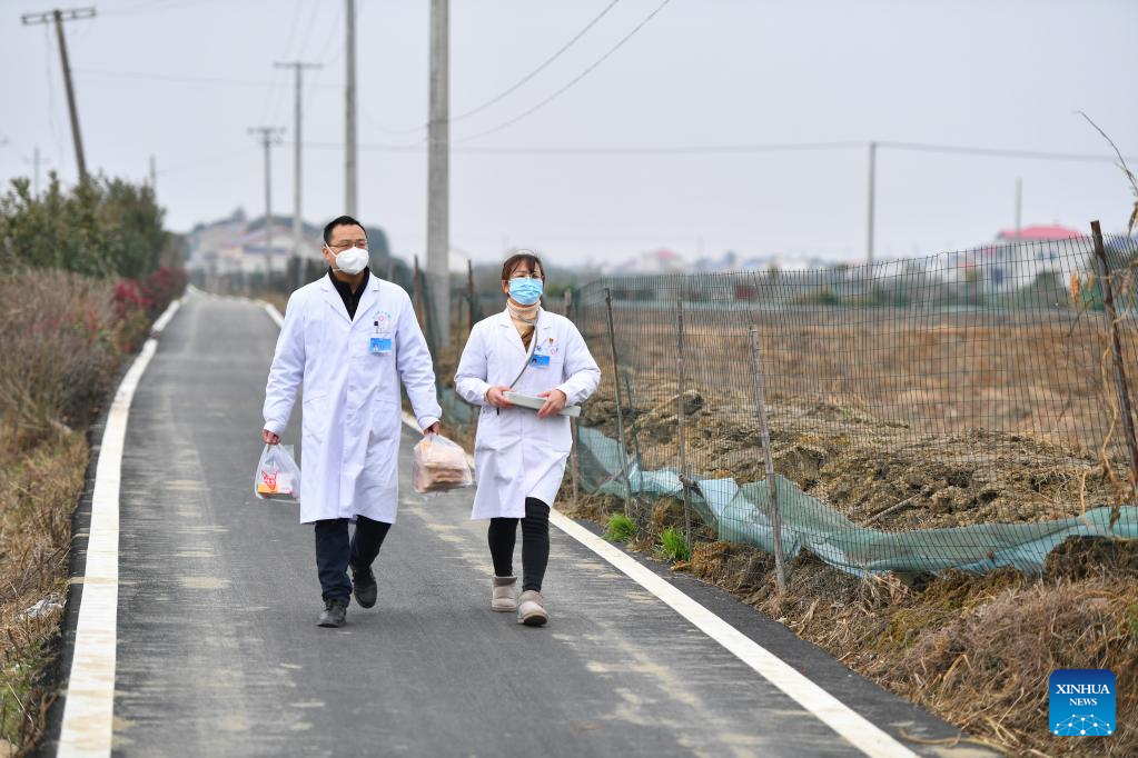 Medical workers prepare to deliver medicine packages and provide door-to-door services for villagers in Panlongling Village of Qiaokou Town, Wangcheng District, Changsha, central China's Hunan Province, Jan. 17, 2023. As the Spring Festival approaches, medical workers from rural health centers of Wangcheng District have provided free traditional Chinese medicine (TCM) care packages and door-to-door services to senior residents and others in need. Wangcheng District has so far delivered more than 21,000 TCM care packages in total to its rural residents. (Xinhua/Chen Zeguo)
