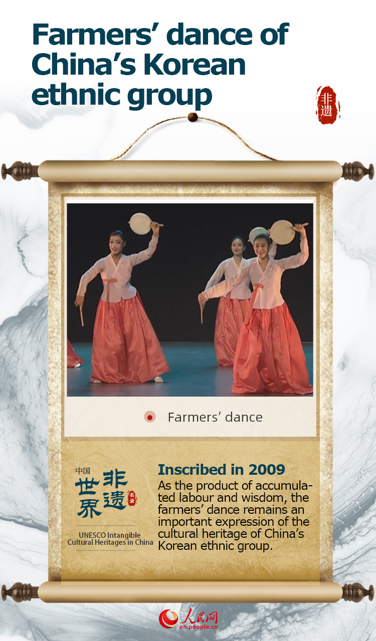 The item “Farmers’ dance of China’s Korean ethnic group” was inscribed on UNESCO's Representative List of the Intangible Cultural Heritage of Humanity in 2009.