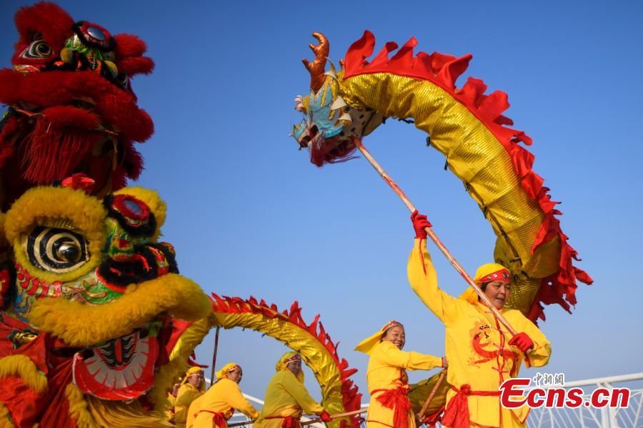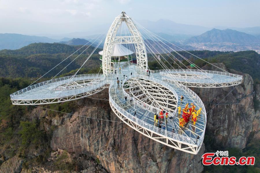 Villagers perform dragon dance on a glass viewing platform to greet the upcoming Spring Festival at Shiniuzhai National Geological Park, central China’s Hunan Province, Jan. 17,, 2023. (Photo: China News Service/Yang Huafeng)