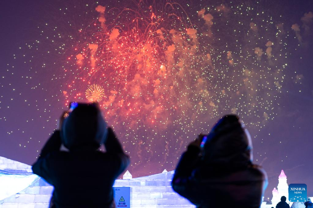 People watch a fireworks show in the Harbin Ice-Snow World theme park in Harbin, northeast China's Heilongjiang Province, Jan. 5, 2023. (Xinhua/Xie Jianfei)
