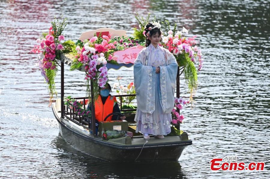 A young woman dressed in traditional Hanfu costume takes part in a cruise parade during the 13th water flower market, a unique tradition during China's Spring Festival in Liwan district of Guangzhou, south China's Guangdong Province, Jan. 18, 2023. (Photo: China News Service/Chen Chuhong)