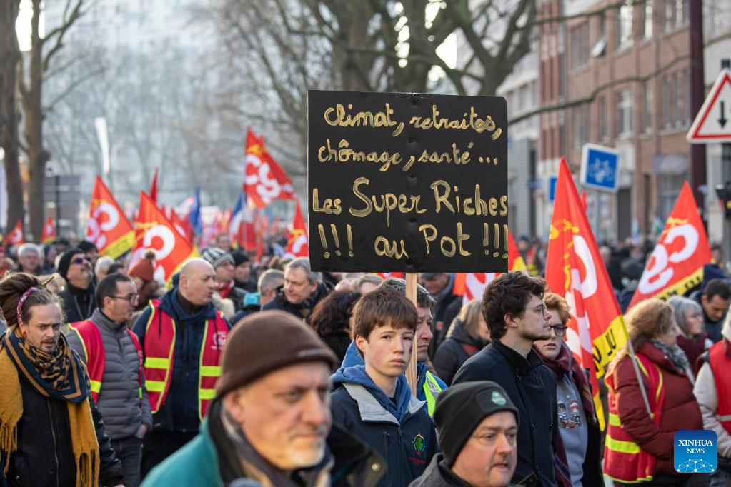 Demonstrators take part in a rally against the government's pension reform plan in Lille, France, on Jan. 19, 2023. France's Ministry of the Interior said that an estimated 1.12 million French people took to the streets across the country on Thursday to protest against the government's controversial pension reform plan. (Photo by Sebastien Courdji/Xinhua)