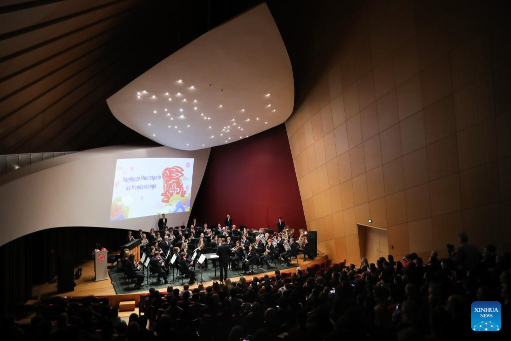 Members of Harmonie Municipale de Mondercange perform during the "Beauty Beyond Words" 2023 Chinese New Year Dance and Music Show at the Philharmonie Luxembourg concert hall in Luxembourg, Jan. 17, 2023. (Xinhua/Zheng Huansong)
