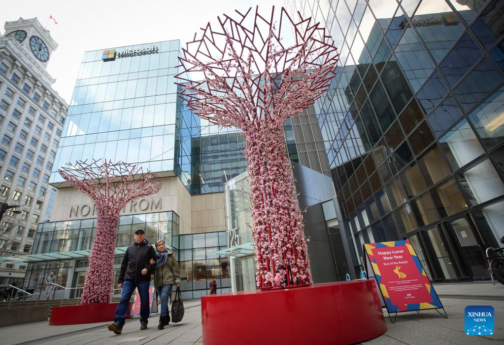 People walk past a Chinese Lunar New Year-themed installation outside a shopping mall in downtown Vancouver, British Columbia, Canada, on Jan. 19, 2023. (Photo by Liang Sen/Xinhua)