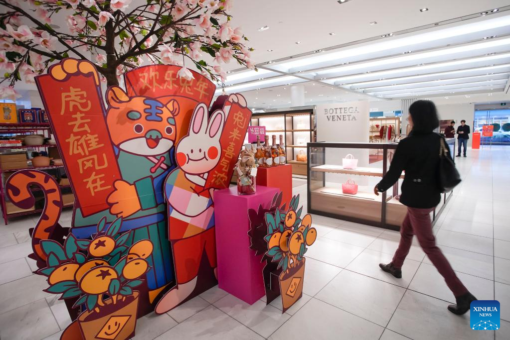 A person walks past a Chinese Lunar New Year-themed installation inside a department store in downtown Vancouver, British Columbia, Canada, on Jan. 19, 2023. (Photo by Liang Sen/Xinhua)