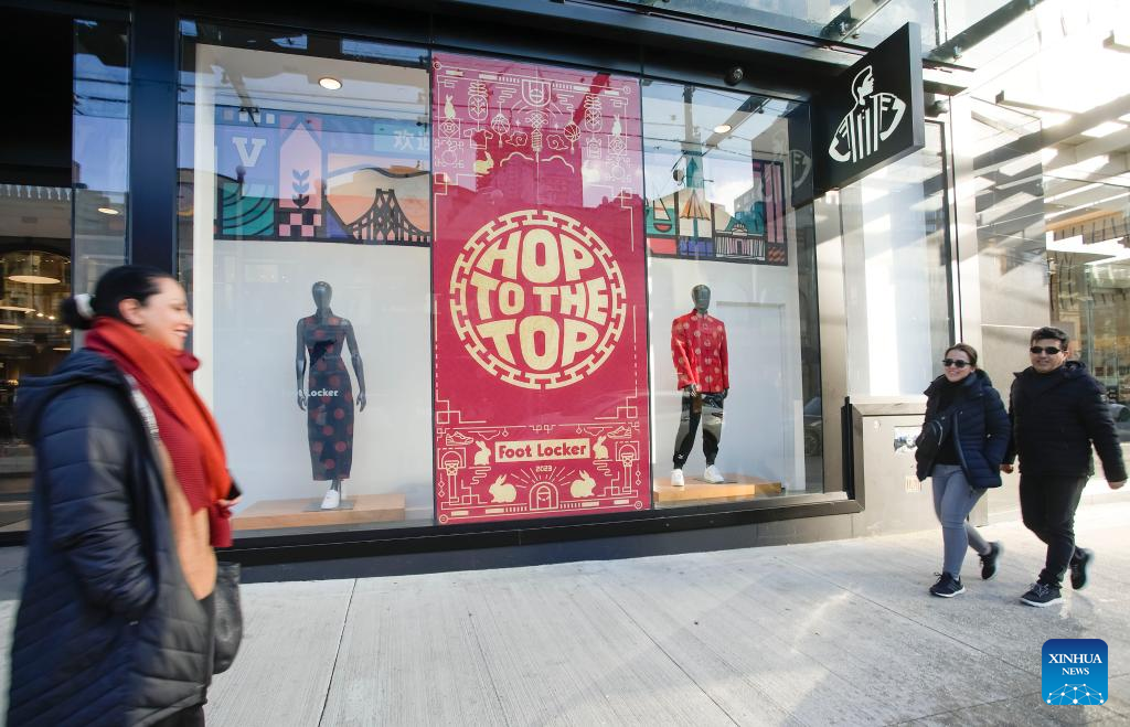 People walk past a Chinese Lunar New Year-themed window display outside a store in downtown Vancouver, British Columbia, Canada, on Jan. 19, 2023. (Photo by Liang Sen/Xinhua)