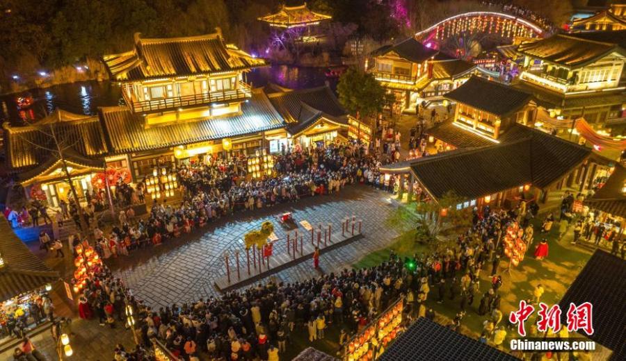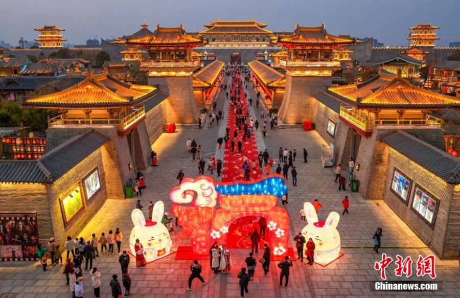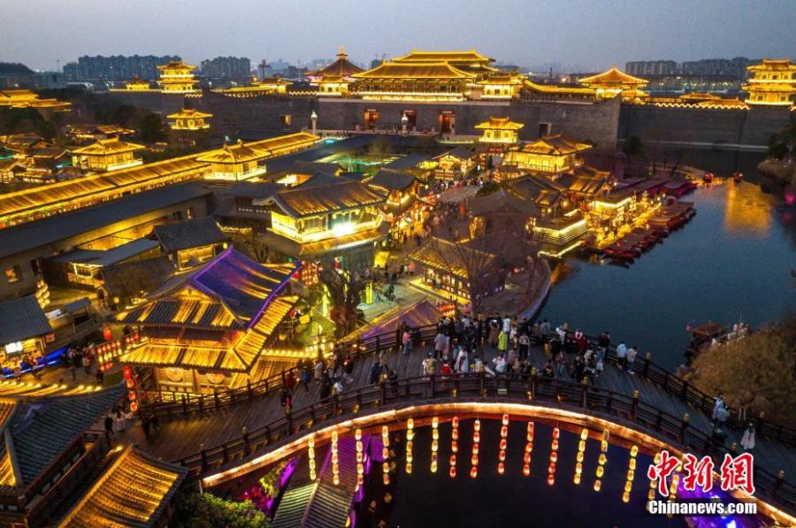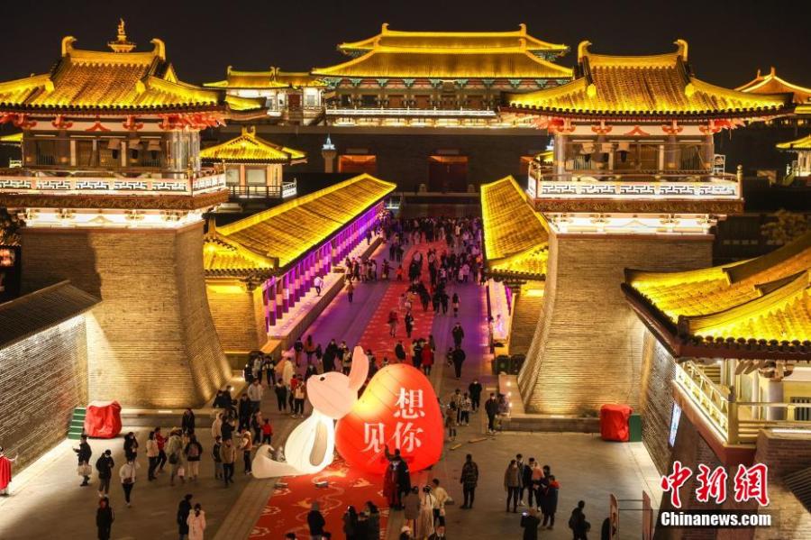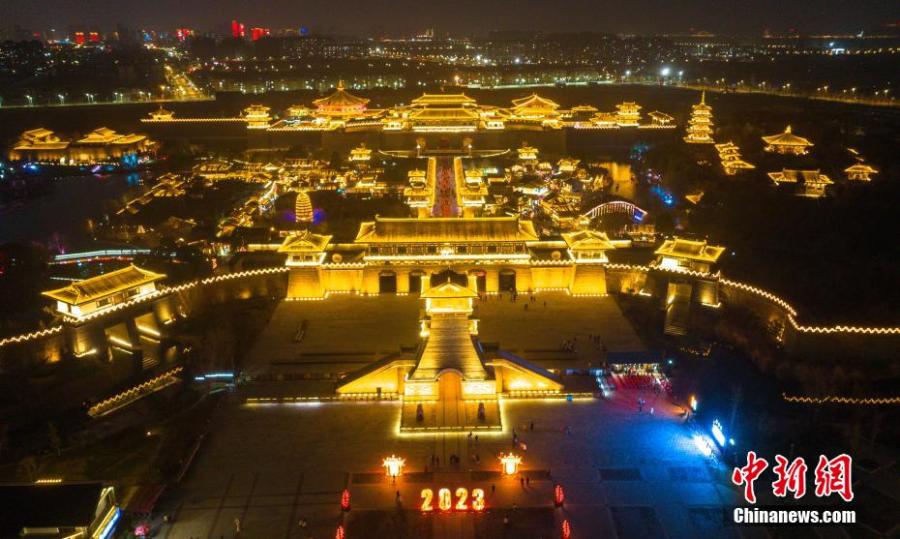 Night view of illuminated Tangcheng scenic spot in Xiangyang, central China's Hubei Province, Jan. 18, 2023. A temple fair was held to welcome the Spring Festival in the ancient city. (Photo: China News Service/Yang Dong)