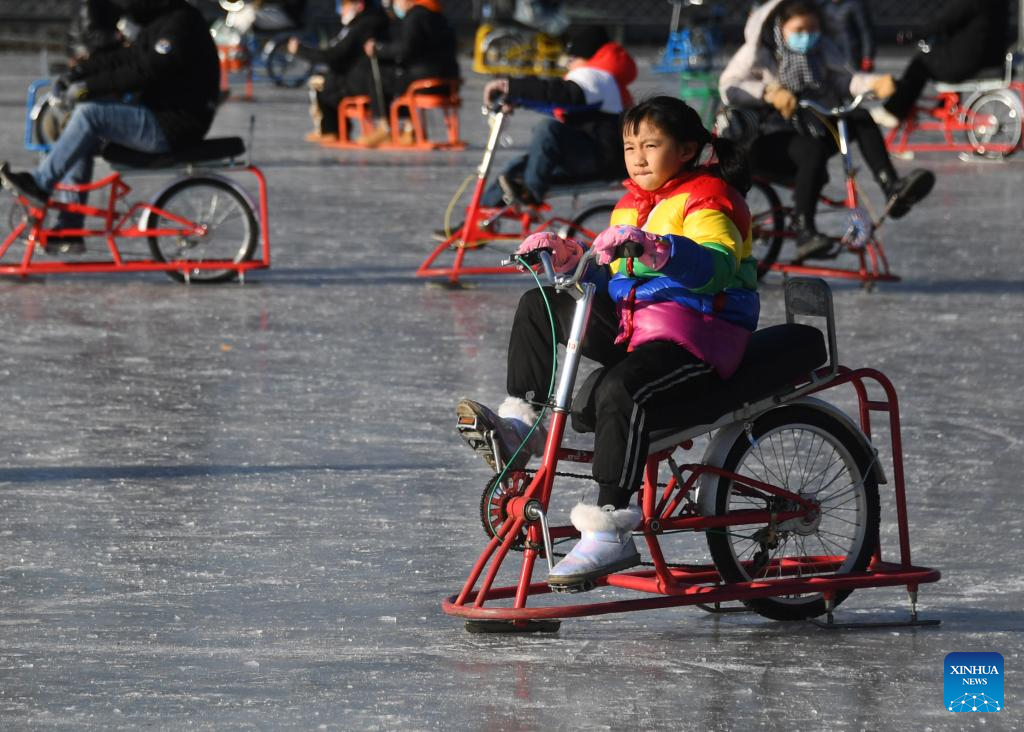 People play on a seasonal outdoor ice rink on the frozen Shichahai lake in Beijing, capital of China, Jan. 20, 2023. (Xinhua/Ren Chao)