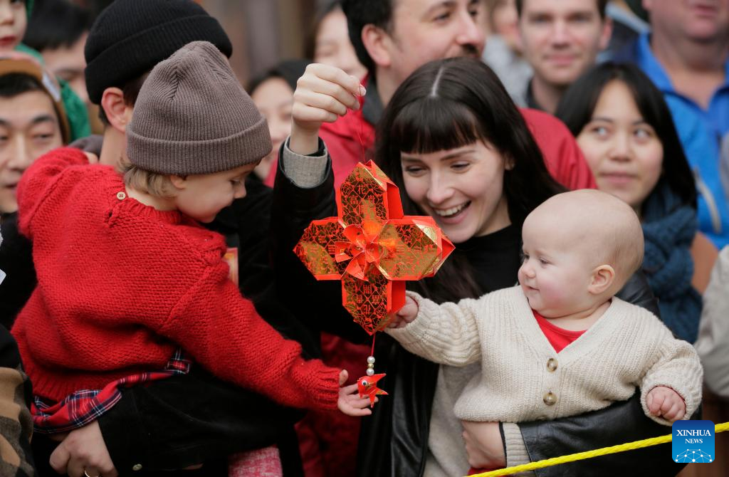 A child holds a lion dance toy during the Chinese New Year celebration at Trafalgar Square in London, Britain, Jan. 22, 2023. (Xinhua/Li Ying)