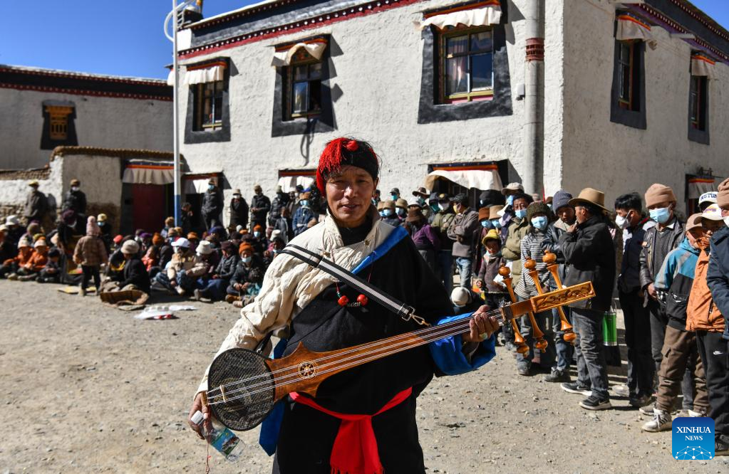 A performer with a Zhanian instrument prepares to stage a show in Mangpu Township of Lnaze County, southwest China's Tibet Autonomous Region, Jan. 21, 2023.