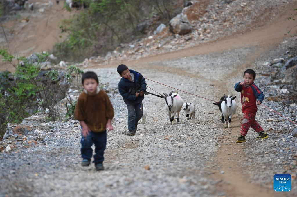 Meng Xuantai (C) helps parents herd goats in Nongding Village of Bansheng Town, Dahua Yao Autonomous County, south China's Guangxi Zhuang Autonomous Region, March 7, 2015.