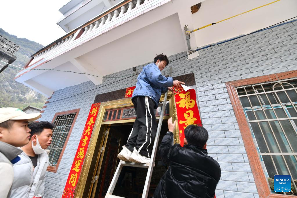 Meng Xuantai (upper) puts up couplets at home in Bansheng Town of Dahua Yao Autonomous County, south China's Guangxi Zhuang Autonomous Region, Jan. 21, 2023.