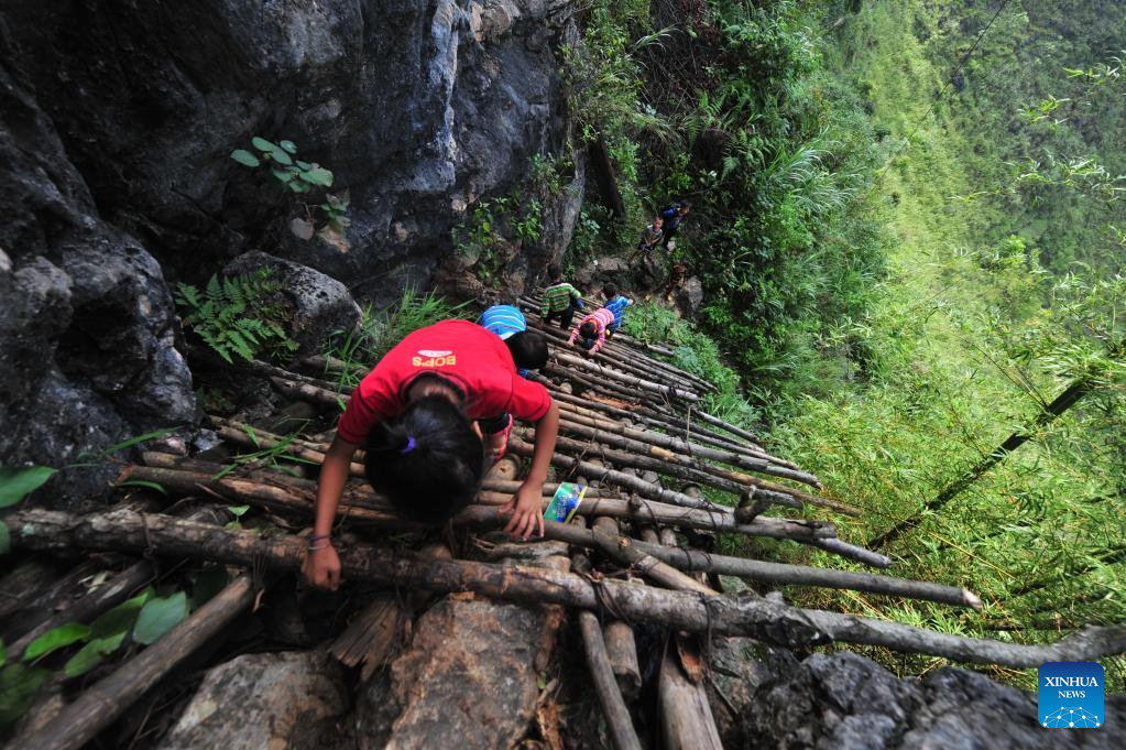 Meng Xuantai (3rd from top) climbs a hanging ladder to go to school in Nongding Village of Bansheng Town, Dahua Yao Autonomous County, south China's Guangxi Zhuang Autonomous Region, Sept. 3, 2012.