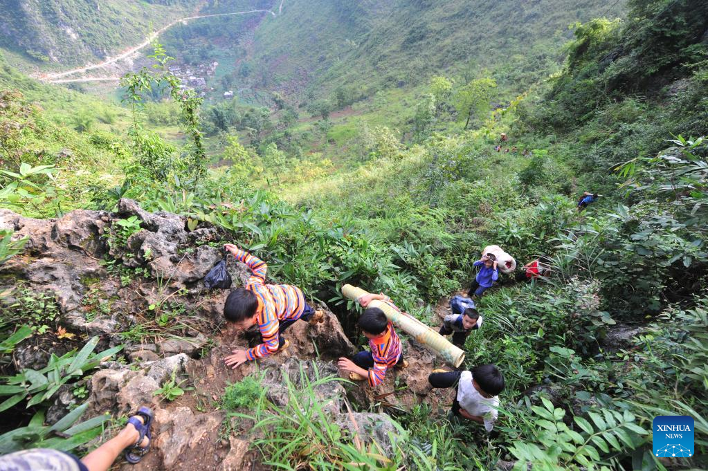 Meng Xuantai (1st L) and Meng Xuanren (2nd L) are on their way to school in Nongding Village of Bansheng Town, Dahua Yao Autonomous County, south China's Guangxi Zhuang Autonomous Region, Sept. 3, 2012.