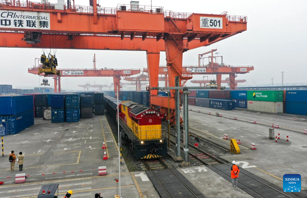 This aerial photo shows a rail-sea intermodal freight train carrying containers of goods, including cars, motorcycles, engines, and sodium carbonate, at Tuanjie Village Central Station in southwest China's Chongqing, Jan. 22, 2023. It was the city's first outbound cargo train of the New International Land-Sea Trade Corridor in the Year of the Rabbit. Goods on the train will be transported to Qinzhou port on the country's southern coast, from where they will be shipped to Indonesia, the Philippines, Australia, and some other countries and regions. (Xinhua/Liu Chan)