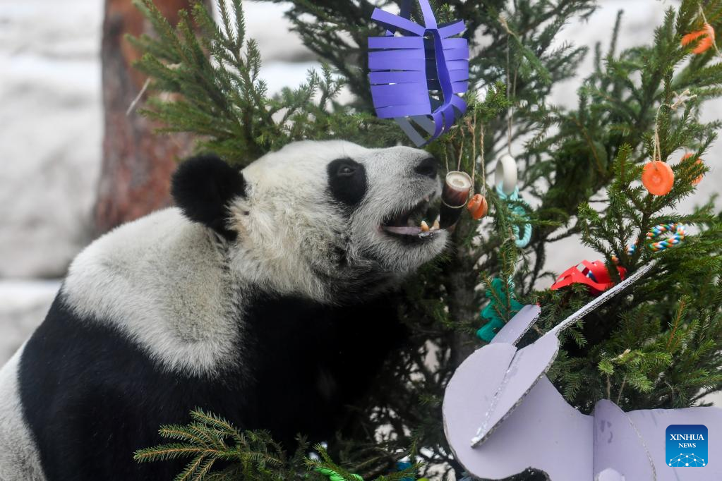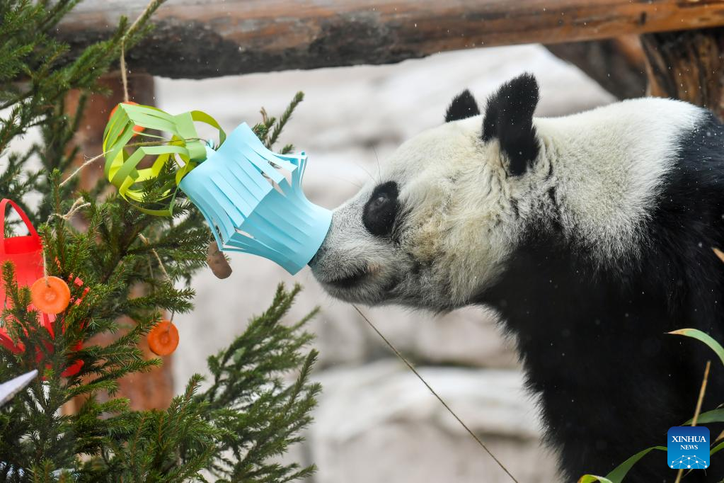 Giant panda Dingding plays with festive decorations at the Moscow Zoo in Moscow, capital of Russia, Jan. 23, 2023. The Moscow Zoo prepared food and festive decorations for giant pandas to celebrate the Chinese Lunar New Year. (Xinhua/Cao Yang)