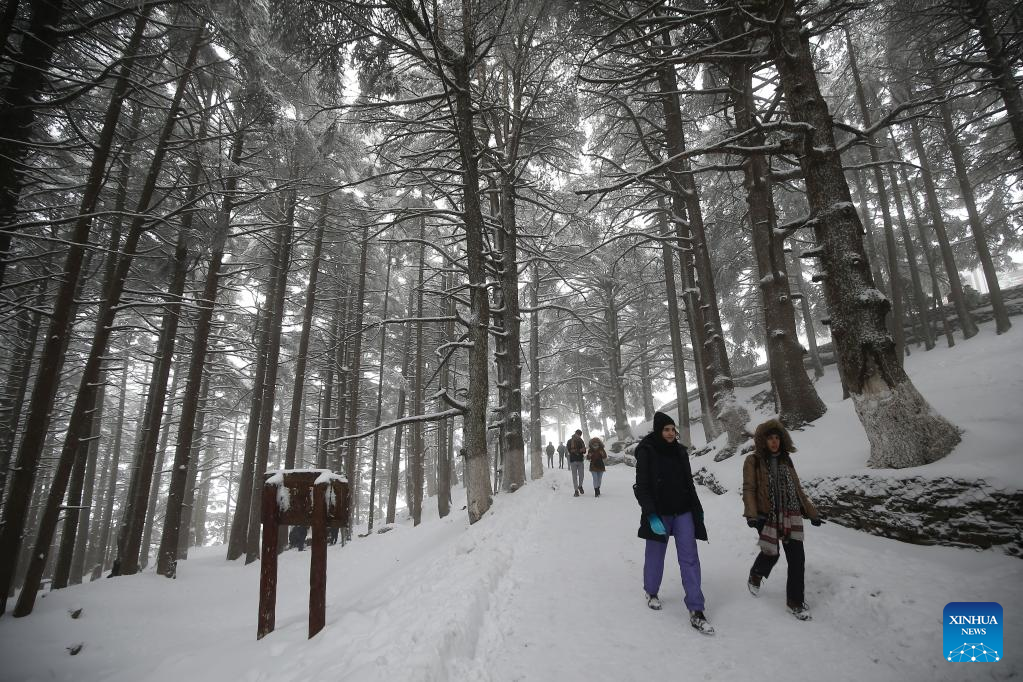 People enjoy the snow at Chrea National Park in Blida province, Algeria, Jan. 23, 2023. (Xinhua)
