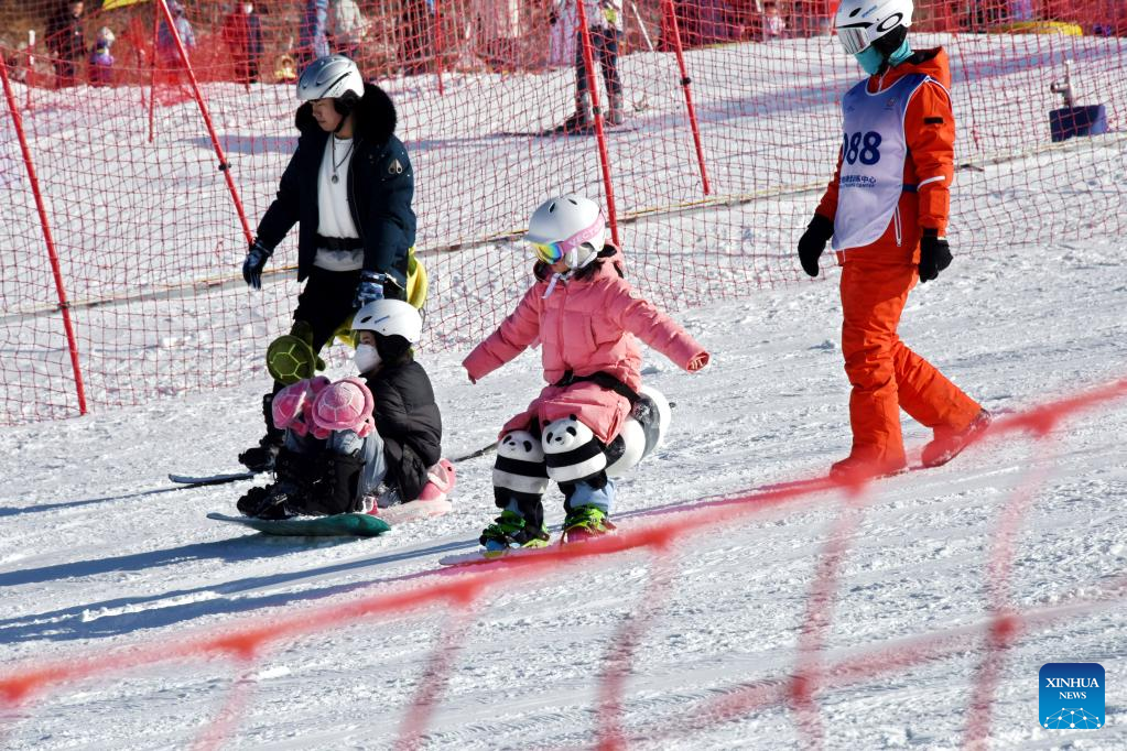 People have fun at a ski resort in Qingdao, east China's Shandong Province, Jan. 25, 2023. During the Spring Festival holiday, ski resorts in Qingdao have made full preparations to improve consumption experience and meet the demand of an increasing number of tourists. (Xinhua/Li Ziheng)